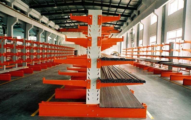 它最为显著的特点就是伸出的悬臂,它可以和阁楼货架、阁楼平台货架等货架进行组合,这种货架适用于存储长条形、环形的货物,因此多在五金店、汽配等领域使用。悬臂式货架主要由立柱片、横梁、轨道、运载小车组成,立柱多采用H型钢或冷轧型钢,悬臂采用方管、冷轧型钢或H型钢,悬臂与立柱间采用插接式或螺栓连接式,底座与立柱间采用螺栓连接式,底座采用冷轧型钢或H型钢。货架的高度通常在2.0米以内最高可高达6米,悬臂长度在1.5米以内,每臂载重通常在800KG以内(仓库货架)。